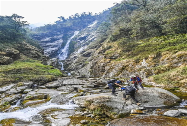 進(jìn)入陰陽山后會(huì)發(fā)現(xiàn),雖然外面驕陽似火,但一旦入谷,行走在參天大樹間就異常涼爽。陰陽山瀑布因瀑布分為兩股,分別由一座高山的陰坡和陽坡直落而下得名。兩條瀑布相距不到200米,越下懸崖后交融,陰陽相擁,注入怒江。瀑布下的懸崖奇峰陡峭,四周是蔥綠的原始森林,古木參天。更神奇的是不管季節(jié)如何變化,瀑布的水始終晶瑩透澈。